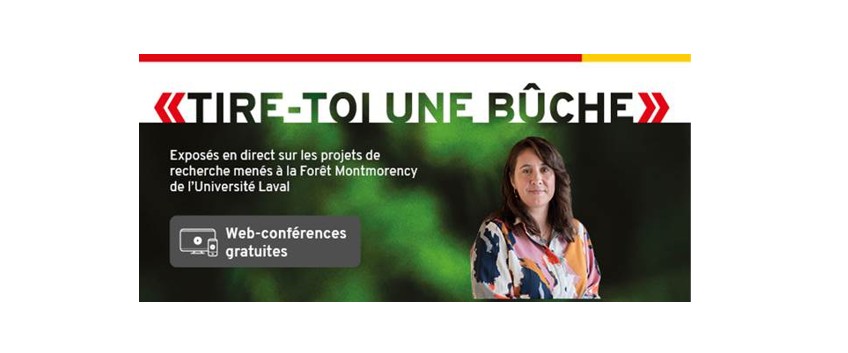 La Faculté de foresterie, de géographie et de géomatique vous invite à une nouvelle saison de «Tire-toi une bûche »! Ces conférences virtuelles présentent les recherches en cours à la Forêt Montmorency. Ouvertes à toutes et à tous, elles vous proposent de plonger au cœur des avancées en foresterie.